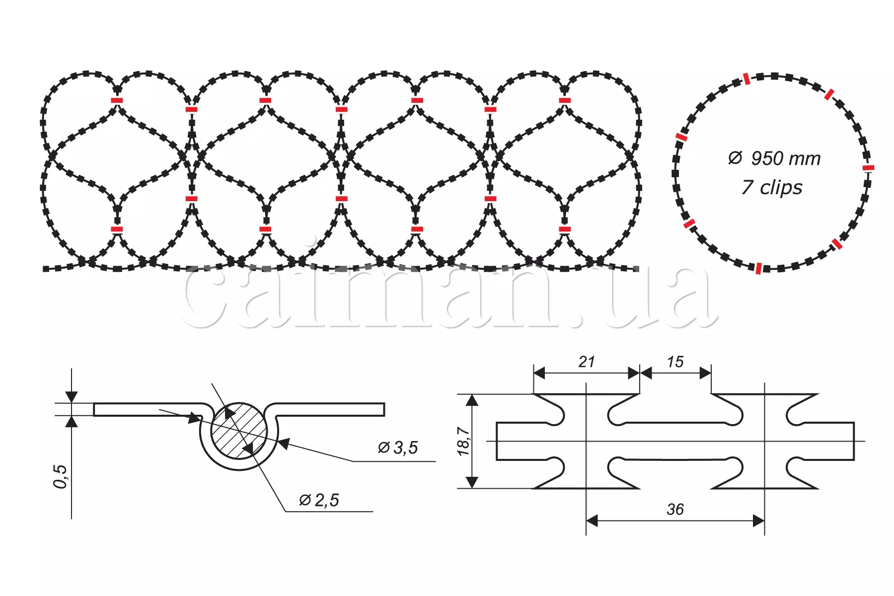 Die Nato-Drahtbarriere Egoza-Standard-950/7 hat einen Durchmesser von 950 mm, sieben Clips pro Windung und kann in einer Entfernung von 19 bis 25 Metern installiert werden. Die empfohlene Länge der Nato-Drahtbarriere Egoza-Standard-950/7 beträgt 19 Meter, wobei die Wirksamkeit der Nato-Drahtbarriere maximal ist und der Durchmesser der Nato-Drahtbarriere in der installierten Form 820-850 mm beträgt.