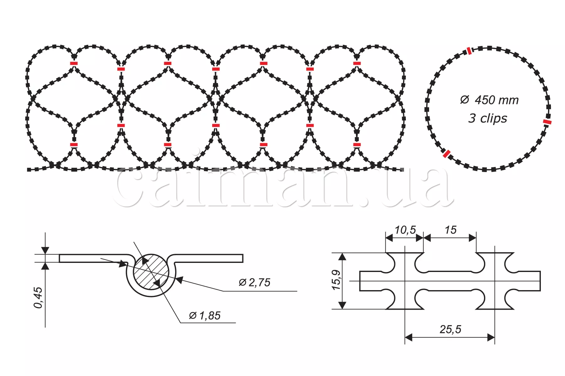 Die Concertina-Nato-Drahtbarriere Gyurza 450/3 hat einen Durchmesser von 450 mm, drei Clips pro Windung und kann in einer Entfernung von 15 bis 23 Metern installiert werden. Die empfohlene Länge der Concertina-Nato-Drahtbarriere Gyurza 450/3 beträgt 15 Meter, wobei die Wirksamkeit der Drahtseilbarriere maximal ist und der Durchmesser der Concertina-Nato-Drahtbarriere in installierter Form 400-410 mm beträgt.