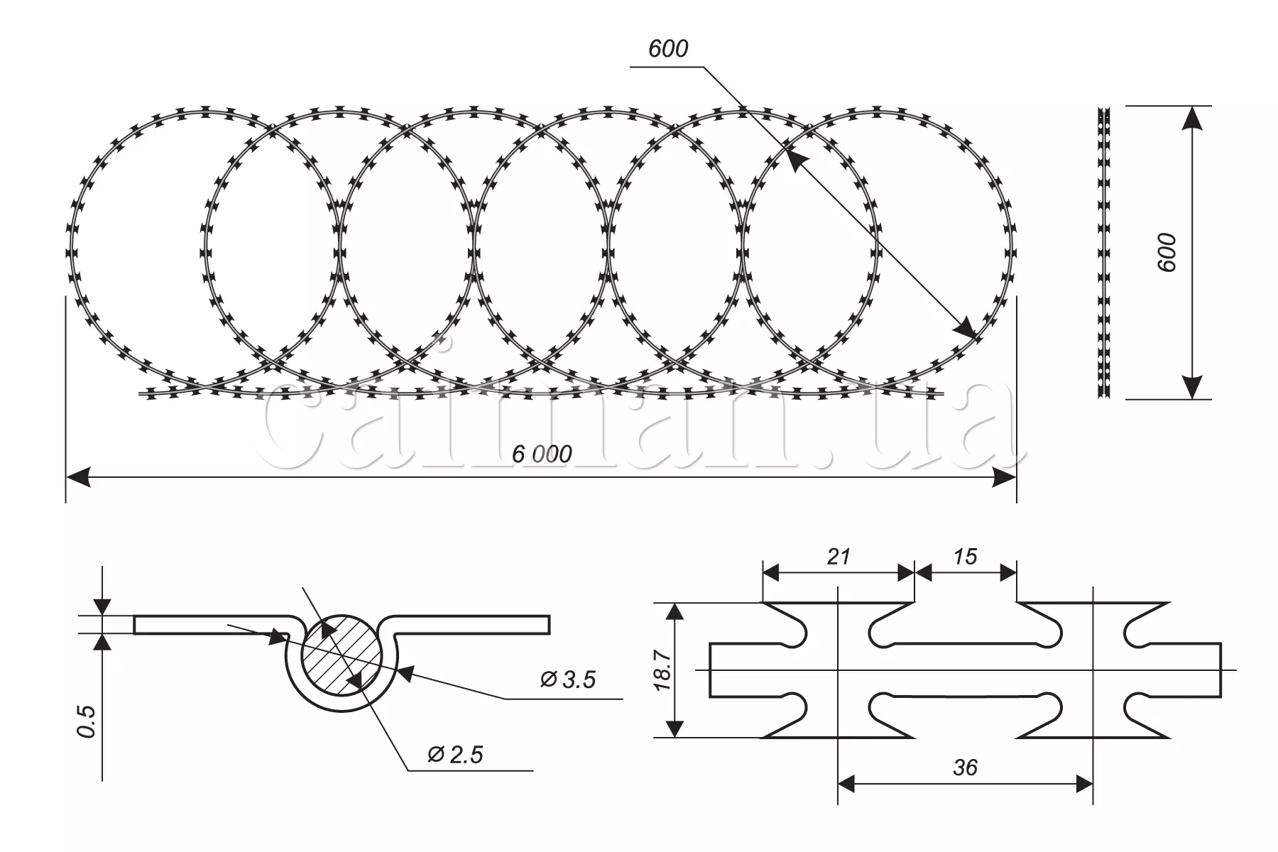 The Egoza-Standard-600 flat barrier has a coil diameter of 600 mm and an installation length of 6 m. When installing the Egoza-Standard-600 flat barrier, its height and length practically do not change and are 0.6 and 6 meters, respectively.