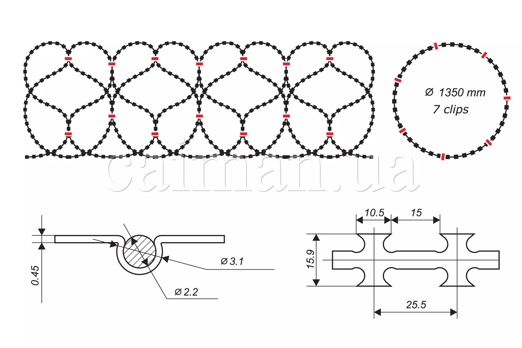 The Concertina-1350/7 razor wire barrier is made from Concertina razor wire with a diameter of 3.1 mm, having a core made of high-carbon steel wire with a diameter of 2.2 mm, which provides it with high reliability and efficiency, as well as a low price, at which you can buy Concertina barriers from us.