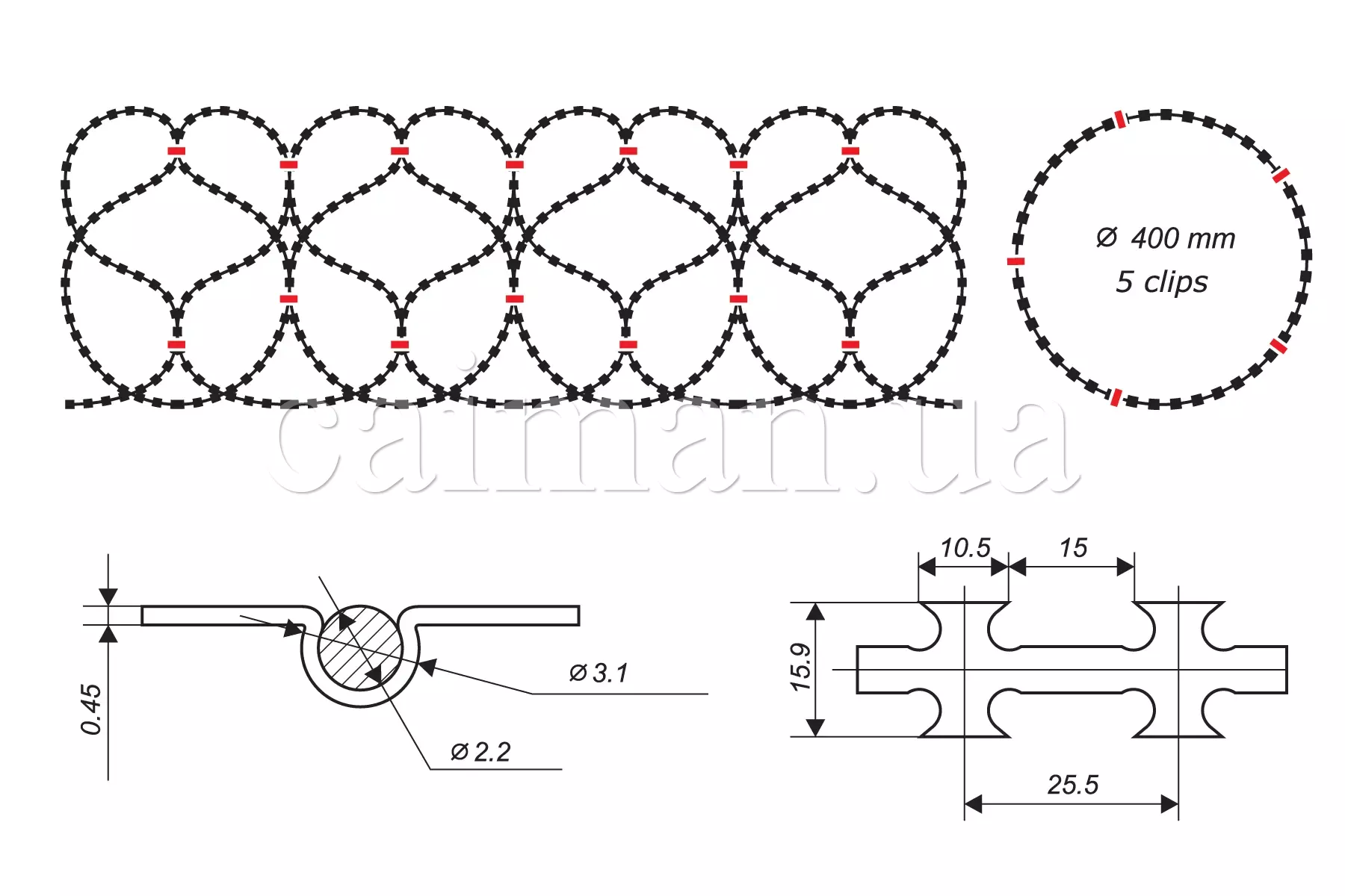 The Concertina-400/5 razor wire barrier has a diameter of 400 mm, five clips per turn and can be installed at a distance of 8 to 10 meters. The recommended stretch of the Concertina-400/5 razor wire barrier is 8 meters, while the effectiveness of the razor wire barrier will be maximum, and the diameter of the concertina wire barrier in its installed form will be 350-360 mm.