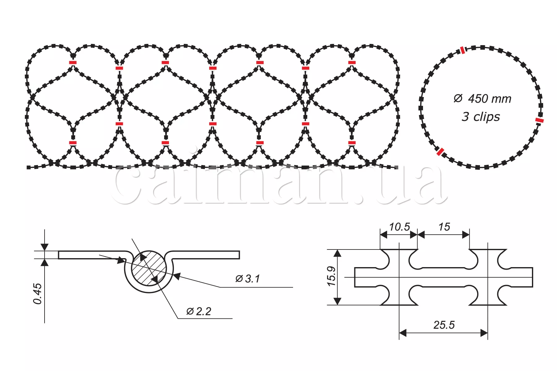 The Concertina-450/3 razor wire barrier has a diameter of 450 mm, three clips per turn and can be installed at a distance of 17 to 23 meters. The recommended stretch of the Concertina-450/3 razor wire barrier is 17 meters, while the effectiveness of the razor wire barrier will be maximum, and the diameter of the concertina wire barrier in its installed form will be 400-410 mm.
