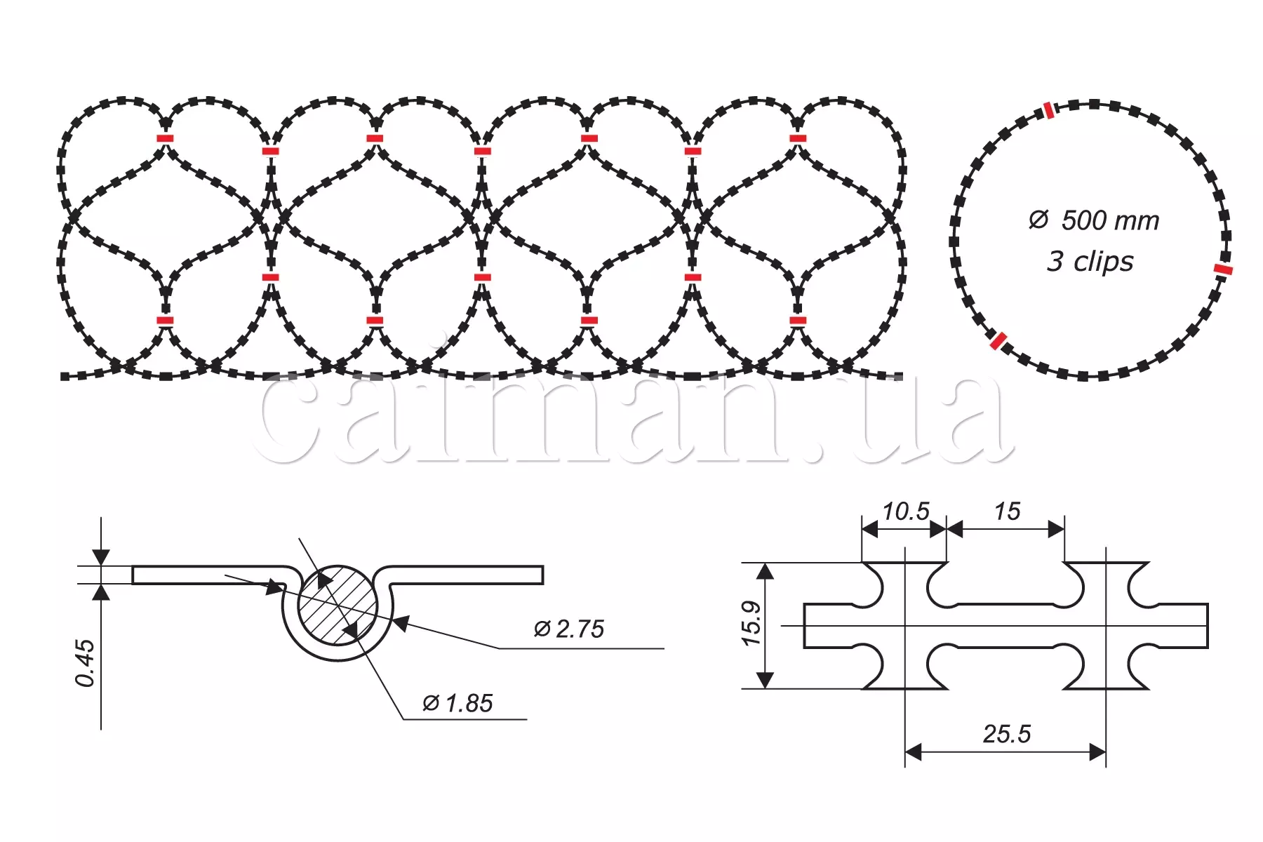 The Gyurza 500/3 concertina wire barrier has a diameter of 500 mm, three clips per turn and can be installed at a distance of 17.5 to 24.5 meters. The recommended stretch of the concertina wire barrier Gyurza 500/3 is 17.5 meters, while the effectiveness of the concertina wire barrier will be maximum, and the diameter of the concertina wire barrier in the installed form will be 440-450 mm.