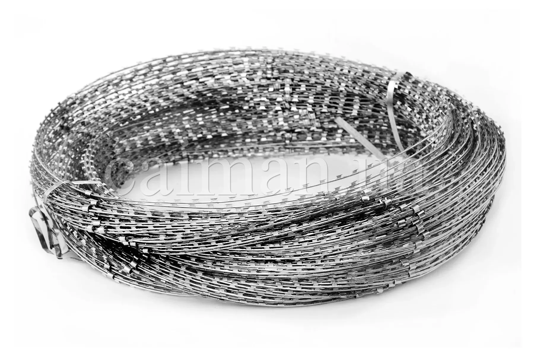 Zasieki Concertina-730/7 wykonany jest z drutu ostrzowego Concertina o średnicy 3,1 mm, posiadającego rdzeń wykonany z drutu ze stali wysokowęglowej o średnicy 2,2 mm, co zapewnia jej wysoką niezawodność i wydajność, a także niską cenę, w jakiej można kupić u nas zasieki koncertina.