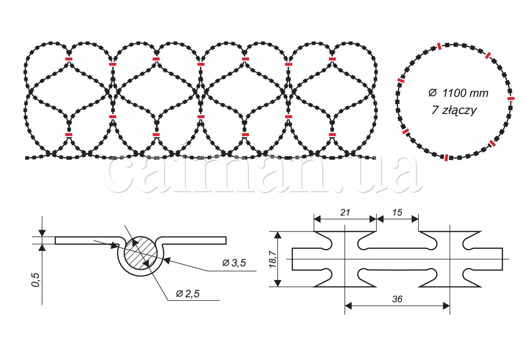 Zasieki koncertina Egoza-Standard-1100/7 wykonany jest z drutu ostrzowego Egoza-Standard o średnicy 3,5 mm, posiadającego rdzeń wykonany z drutu ze stali wysokowęglowej o średnicy 2,5 mm, co zapewnia jej wysoką niezawodność i skuteczność, a także niską cenę, w jakiej można kupić u nas zasieki Egoza-Standard.