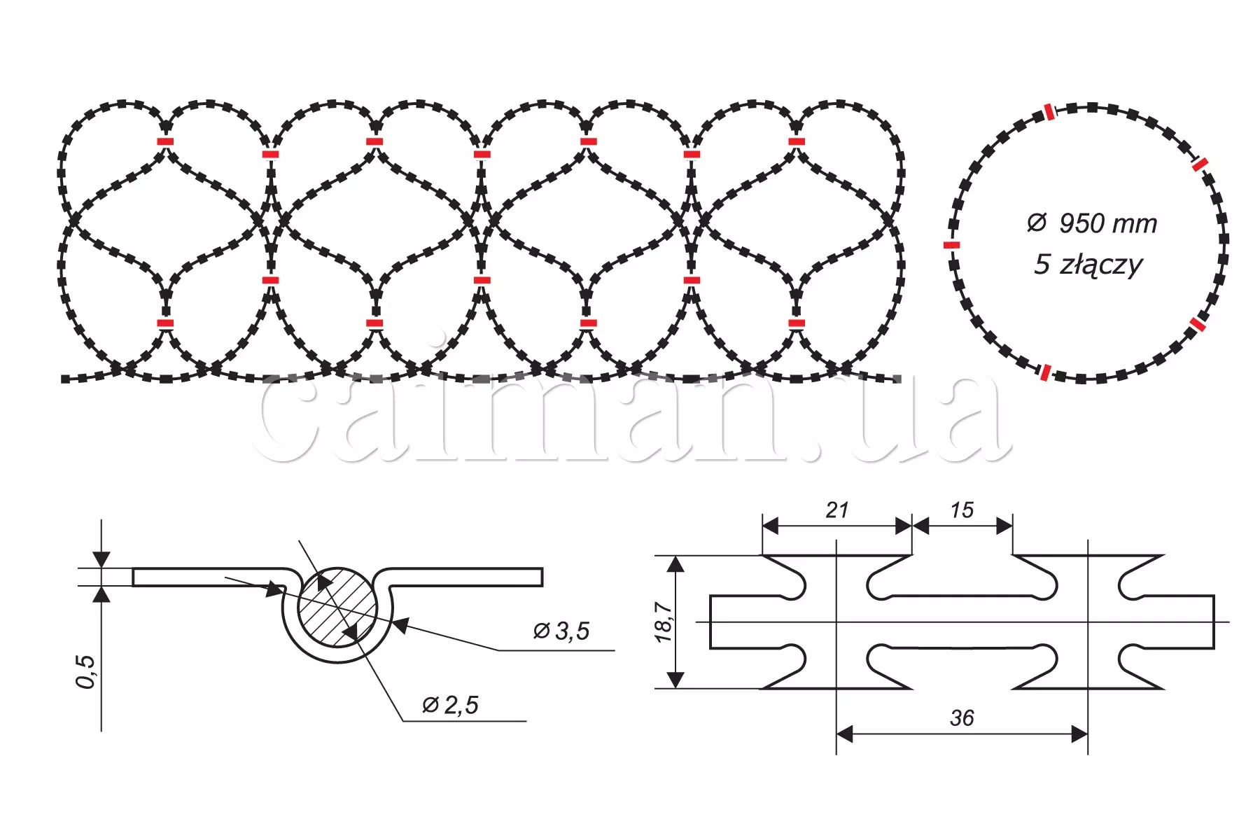 Zasieki koncertina Egoza-Standard-950/5 wykonany jest z drutu ostrzowego Egoza-Standard o średnicy 3,5 mm, posiadającego rdzeń wykonany z drutu ze stali wysokowęglowej o średnicy 2,5 mm, co zapewnia jej wysoką niezawodność i skuteczność, a także niską cenę, w jakiej można kupić u nas zasieki Egoza-Standard.