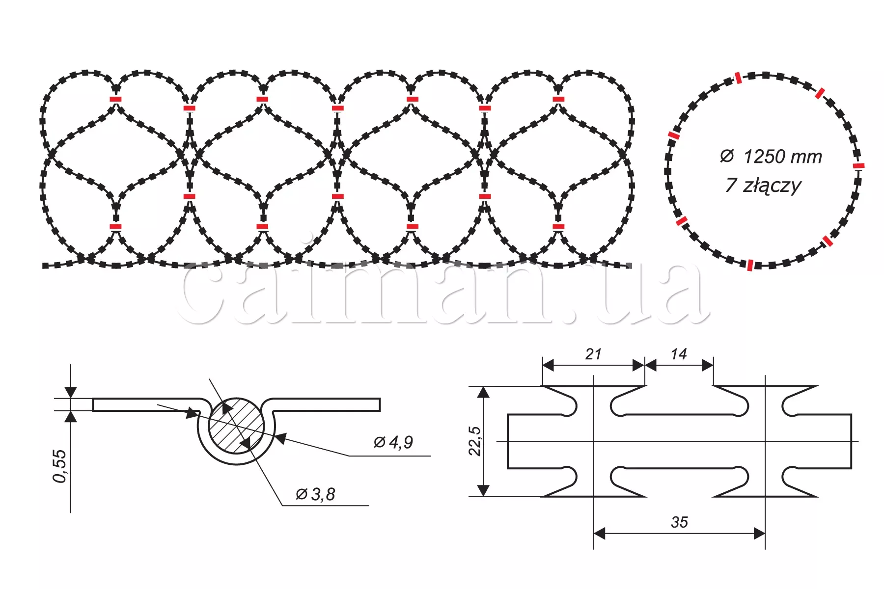 Zasieki koncertina Egoza-Super-1250/7 ma średnicę 1250 mm, siedem zacisków na obrót i może być instalowana w odległości od 17 do 24 metrów. Zalecany zasieków koncertina Egoza-Super-1250/7 wynosi 17 metrów, podczas gdy skuteczność zasieków koncertina będzie maksymalna, a średnica zasieków koncertina w zainstalowanej formie będzie wynosić 1090-1130 mm.