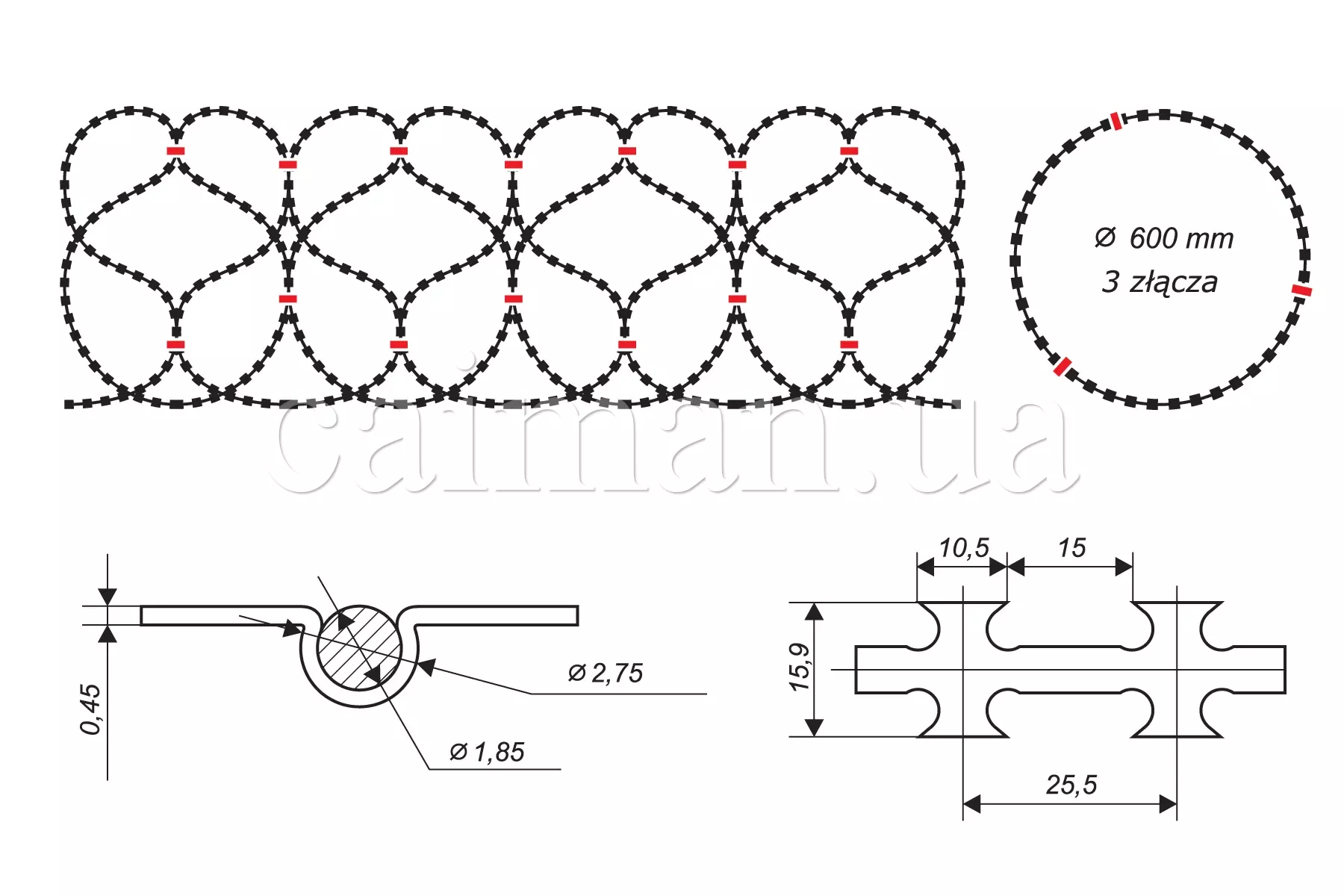Zasieki koncertina Gyurza 600/3 ma średnicę 600 mm, trzy złączki na obrót i może być instalowana w odległości od 19 do 26 metrów. Zalecany odcinek zasieków koncertina Gyurza 600/3 wynosi 19 metrów, przy czym skuteczność ogrodzenia z drutu ostrzowego będzie maksymalna, a średnica bariery spiralnej w postaci zamontowanej będzie wynosić 530-540 mm.