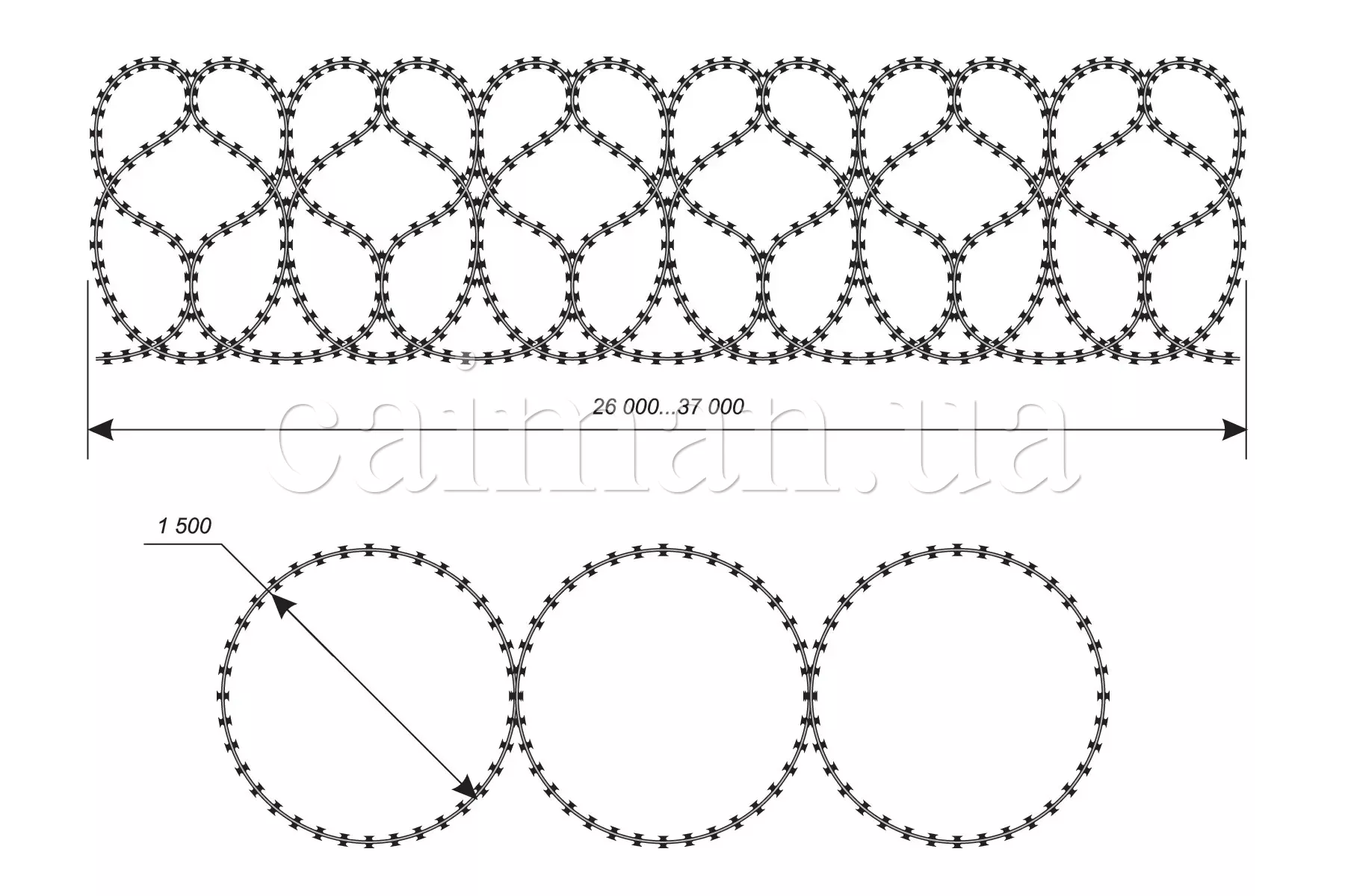 Колюче-ріжуча дротяна сітка КРДС Концертина-3х1500/7 складається з трьох спіральних загороджень ЗКР-С Концертина-1500/7. Розроблена як аналог малопомітної перешкоди, колюче-ріжуча дротяна сітка Концертина є гнучкою загородою, яка легко деформується та добре заплутує порушника. З цієї причини його ширина, висота та установча довжина можуть значно змінюватись в залежності від конкретних умов та завдання при її монтажі.