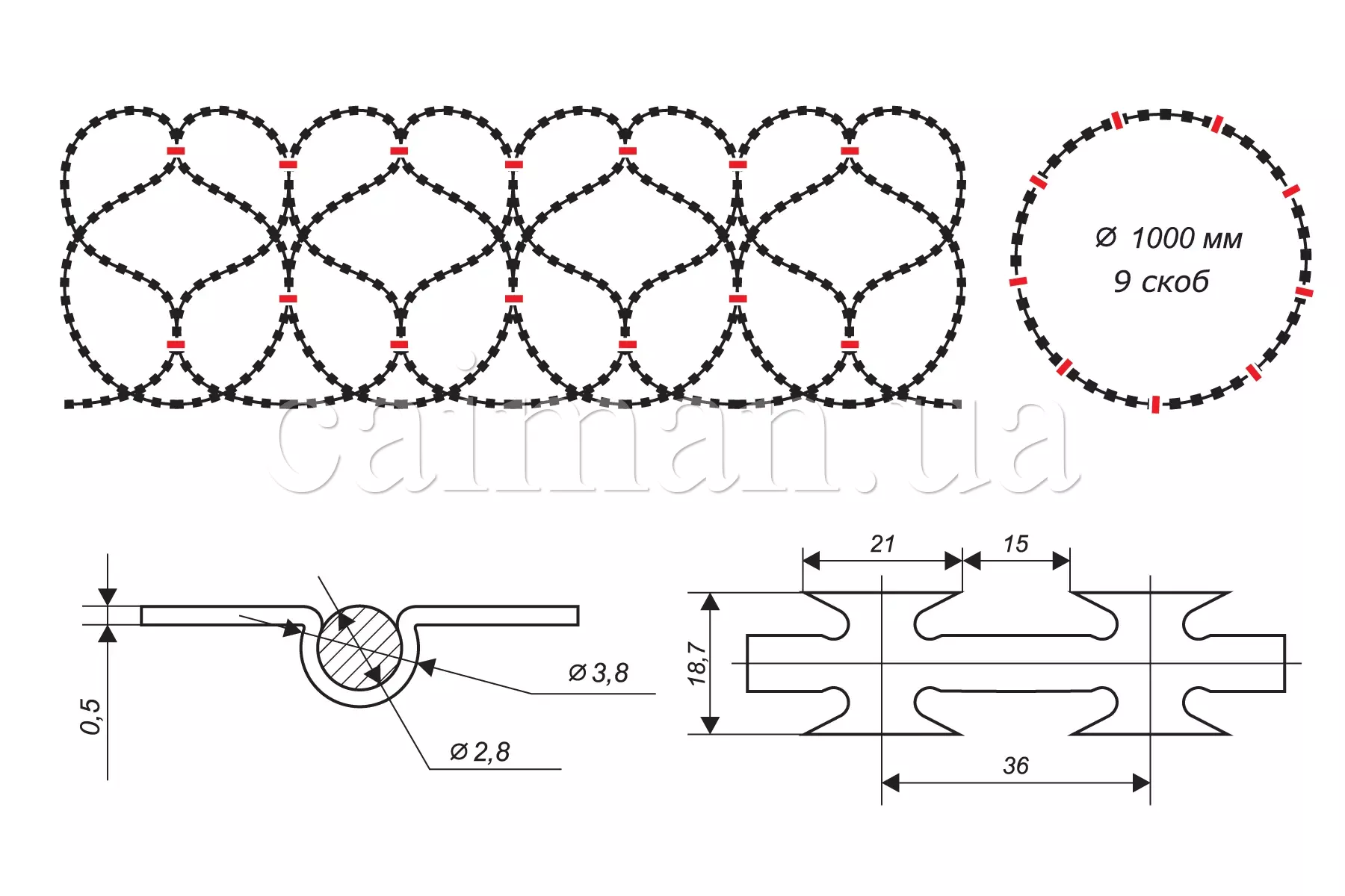 Спіральний бар'єр безпеки Єгоза-Кайман-1000/9 виготовляється з колючого дроту Єгоза-Кайман діаметром 3,8 мм, що має осердя з високовуглецевого сталевого дроту діаметром 2,8 мм, що забезпечує йому високу надійність і ефективність, а також низьку ціну, за якою у нас можна купити загородження Єгоза-Кайман.