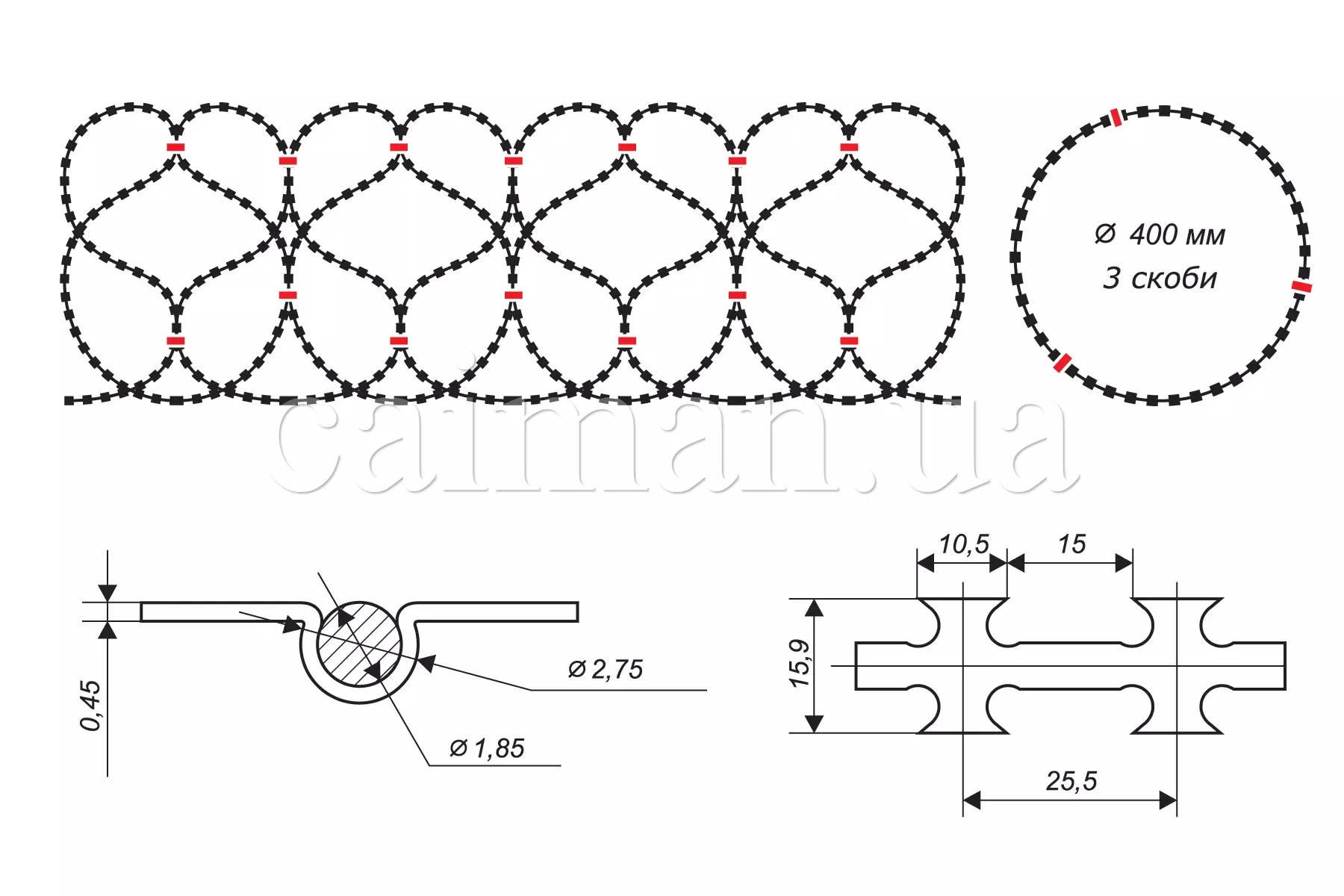 Загородження спіральне колюче-ріжуче ЗКР-С Гюрза 400/3 має діаметр 400 мм, три скоби на виток і може бути встановлений на відстань від 13,5 до 21 метра. Розтягування спірального бар'єру ЗКР-С Гюрза 400/3, що рекомендується, становить 13,5 метра, при цьому ефективність загородження з колючого дроту буде максимальною, при цьому діаметр спірального бар'єра в установленому вигляді складе 350-360 мм.