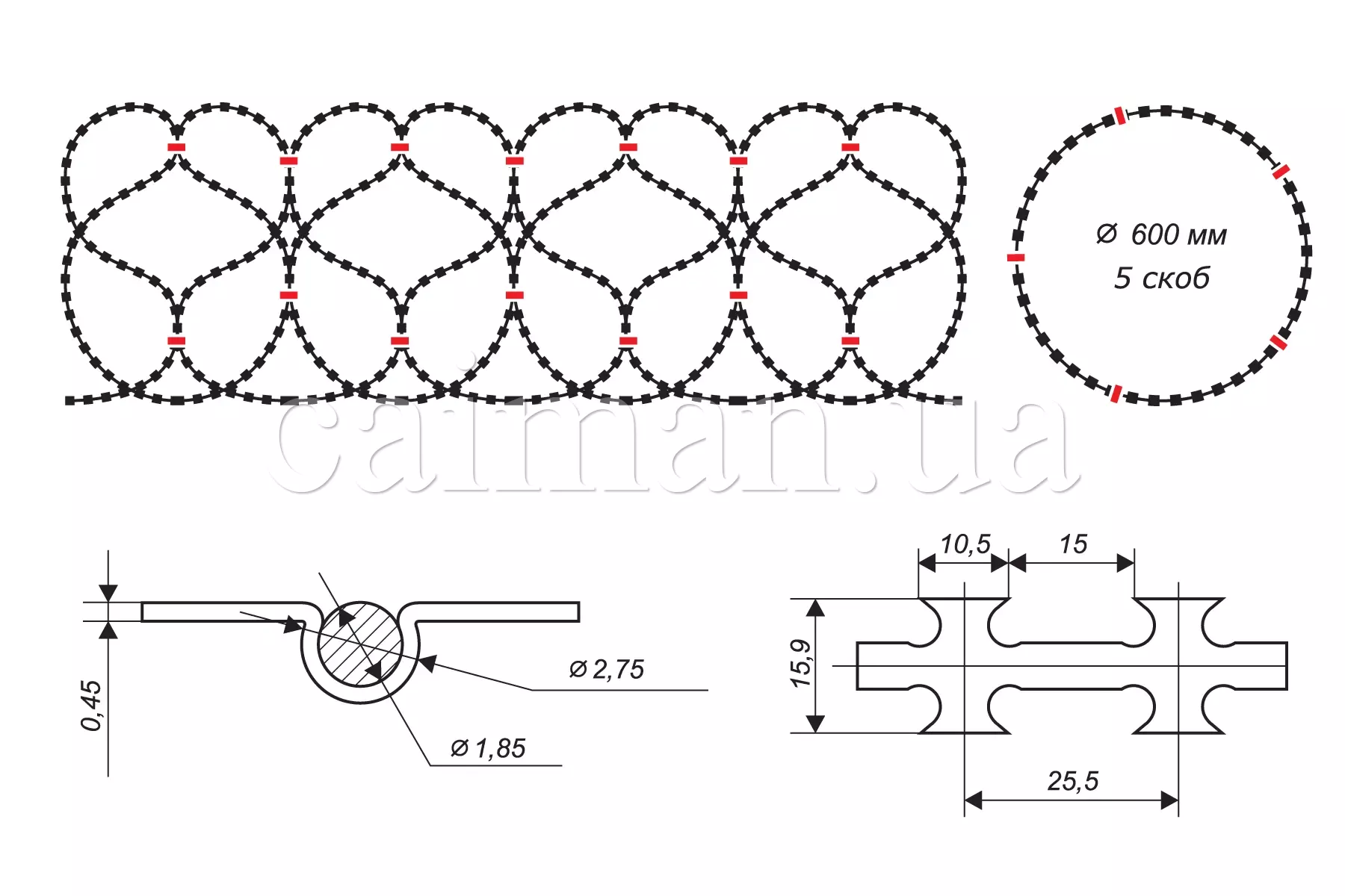 Загородження спіральне колюче-ріжуче ЗКР-С Гюрза 600/5 має діаметр 600 мм, п'ять скоб на виток і може бути встановлене на відстань від 15 до 19 метрів. Розтягування спірального бар'єру ЗКР-С Гюрза 600/5 складає 15 метрів, при цьому ефективність загородження з колючого дроту буде максимальною, при цьому діаметр спірального бар'єра в установленому вигляді складе 530-540 мм.