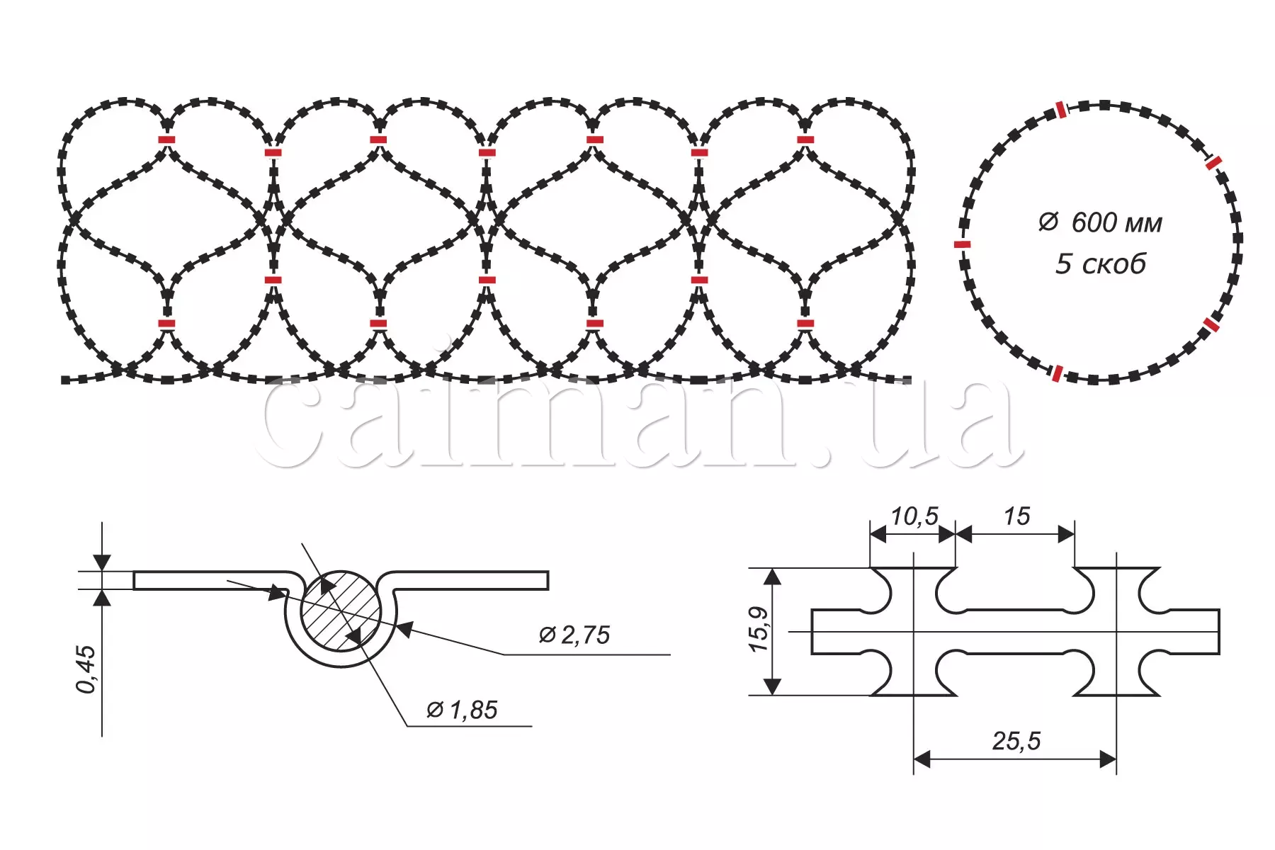 Заграждение спиральное колюче-режущее ЗКР-С Гюрза 600/5 имеет диаметр 600 мм, пять скоб на виток и может быть установлено на расстояние от 15 до 19 метров. Растяжение спирального барьера ЗКР-С Гюрза 600/5 составляет 15 метров, при этом эффективность ограждения из колючей проволоки будет максимальной, при этом диаметр спирального барьера в установленном виде составит 530-540 мм.
